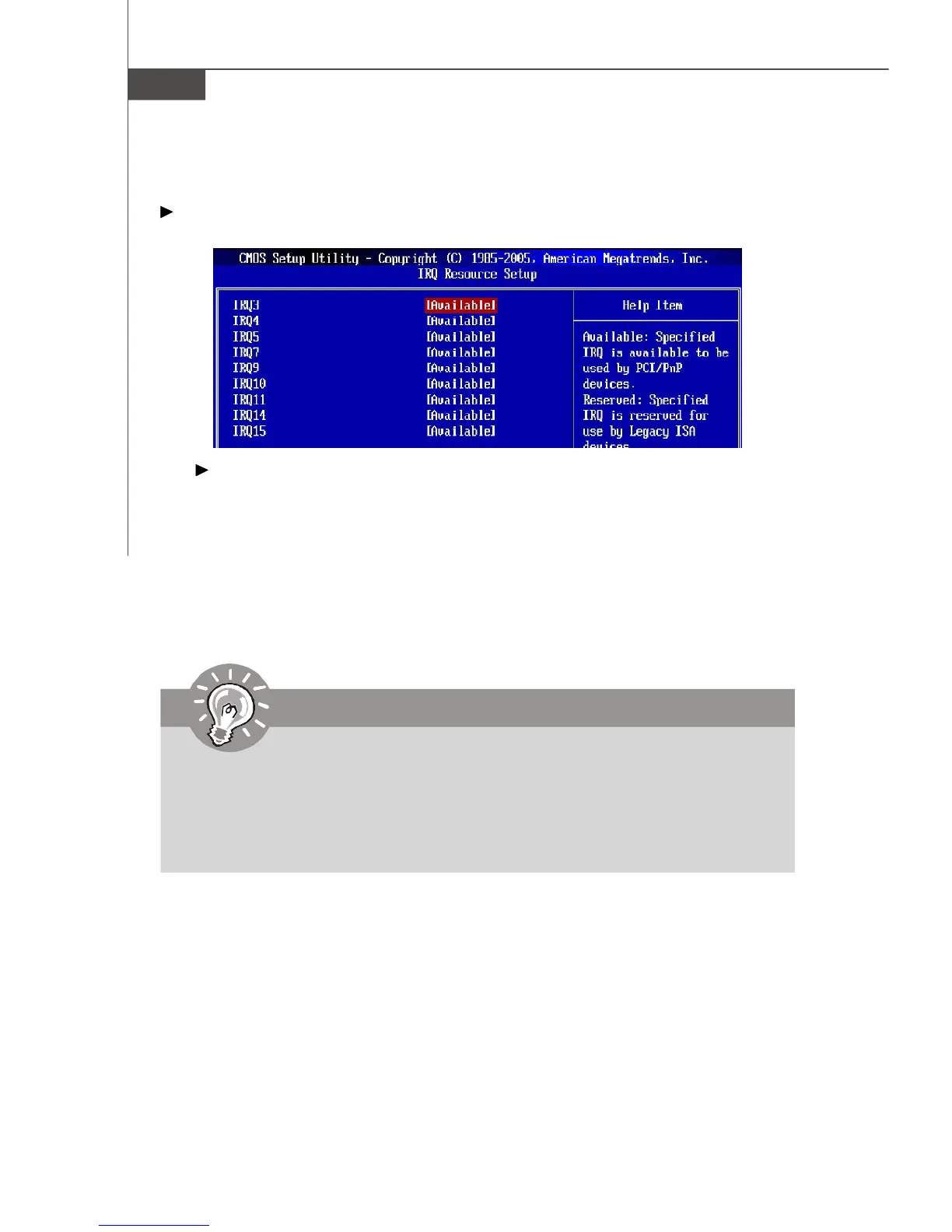 AMIBIOS. All IRQs used by onboard I/O are configured as [Available]. If all IRQs