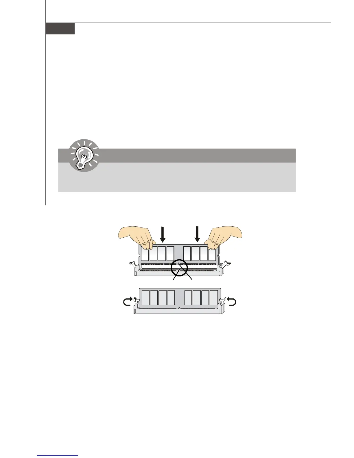2. Вставьте модуль в DIMM слот в вертикальном направлении. атем нажмите на
