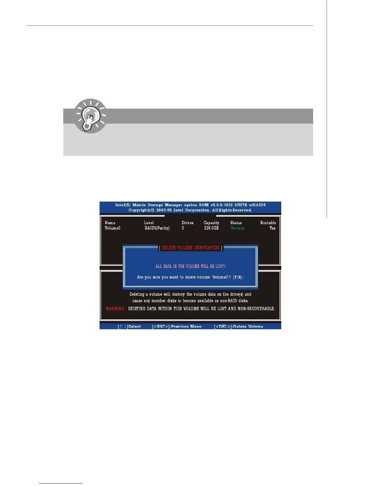 <Enter> key to select a RAID volume for deletion. Then press <Delete> key to