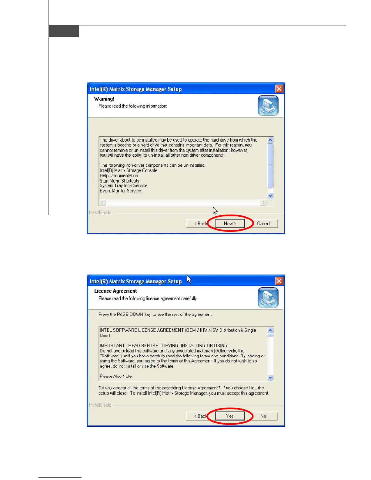 MSI MS-7392 - Installing Intel Matrix Storage Console (continued); License Agreement and Component Selection