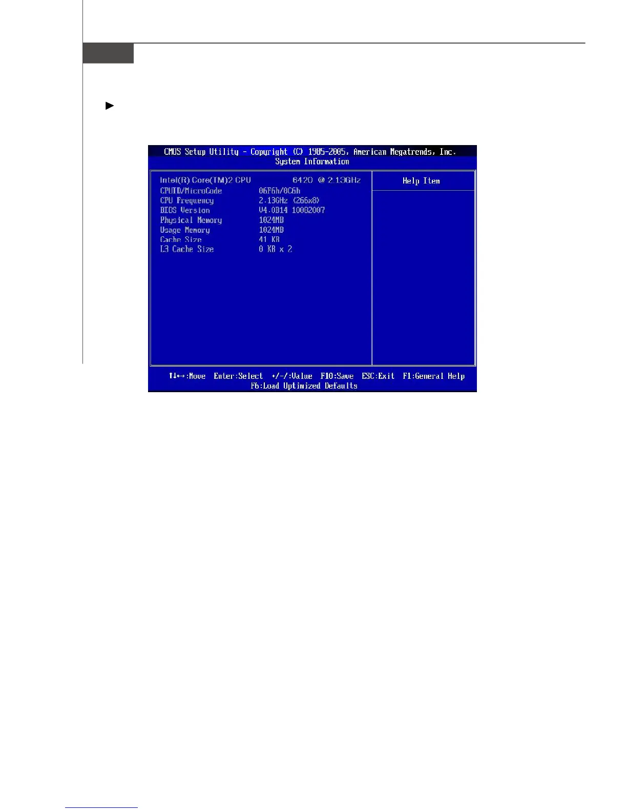 This sub-menu shows the CPU information, BIOS version and memory status of your