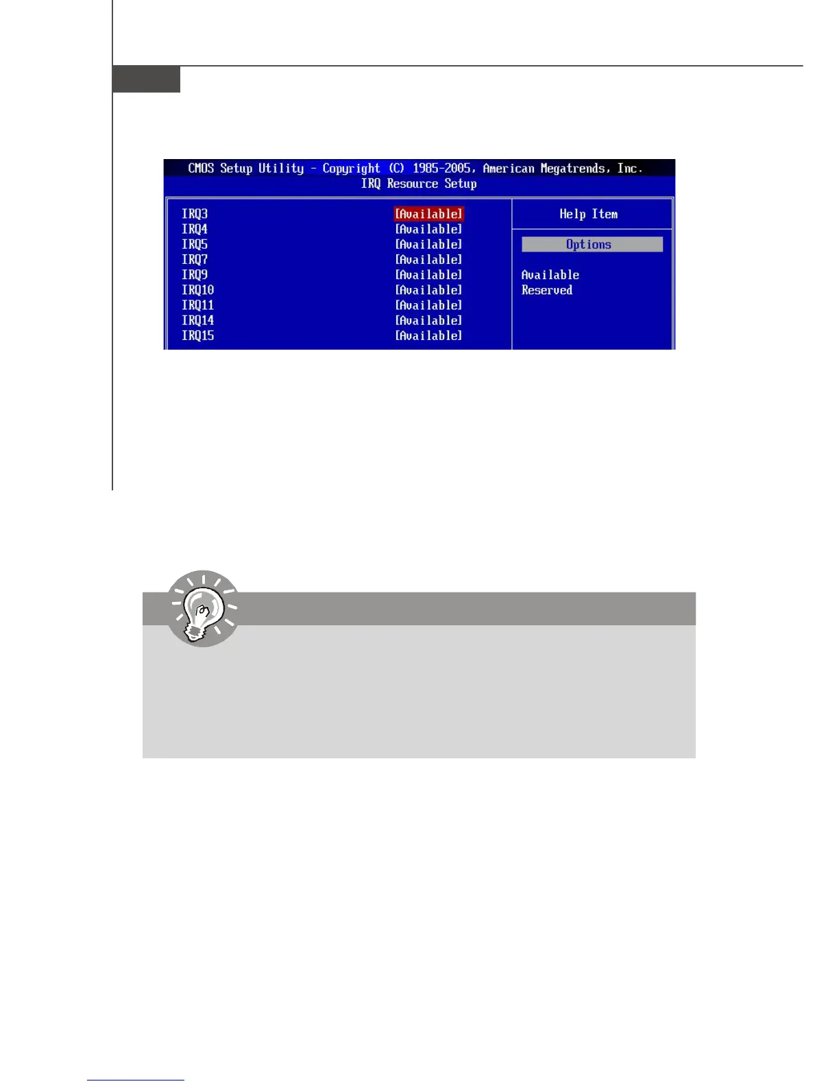IRQs used by onboard I/O are configured as [Available]. If all IRQs are set to