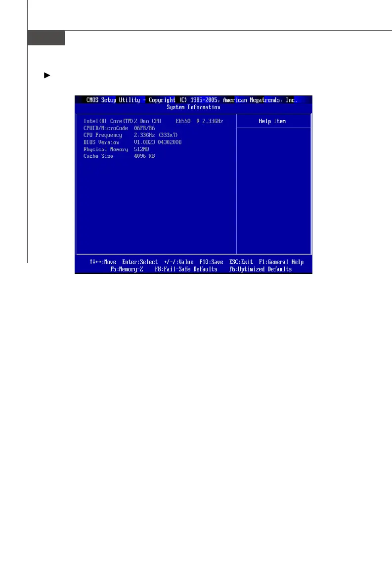 This sub-menu shows the CPU information, BIOS version and memory status of your