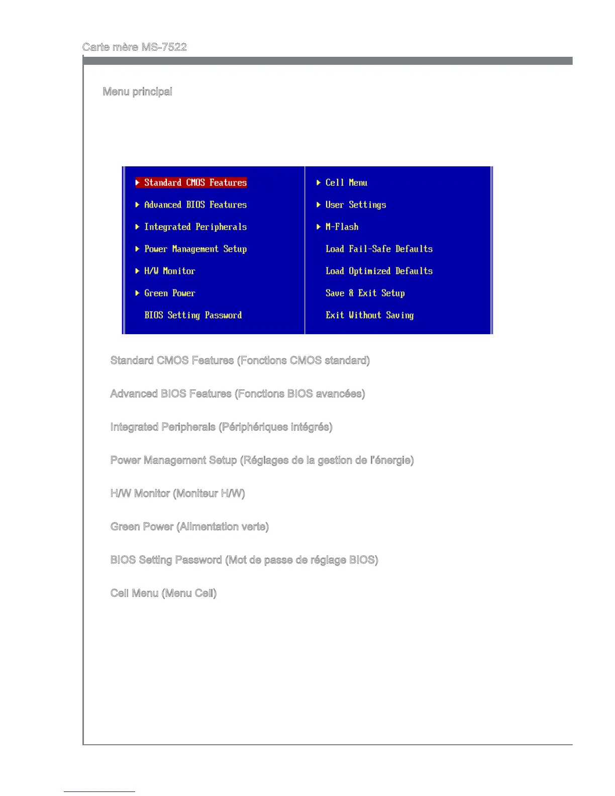 Une fois entré dans l’unité de réglages BIOS CMOS, le menu principal appaît sur