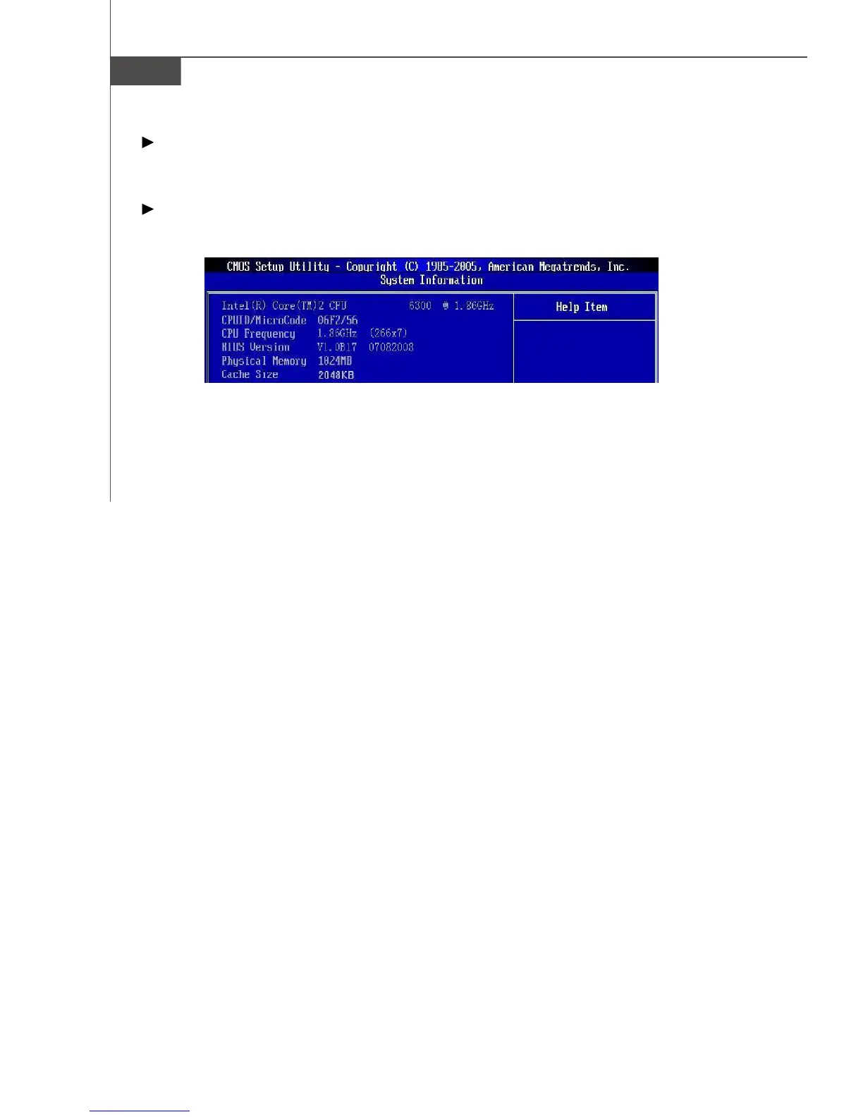 This sub-menu shows the CPU information, BIOS version and memory status of your