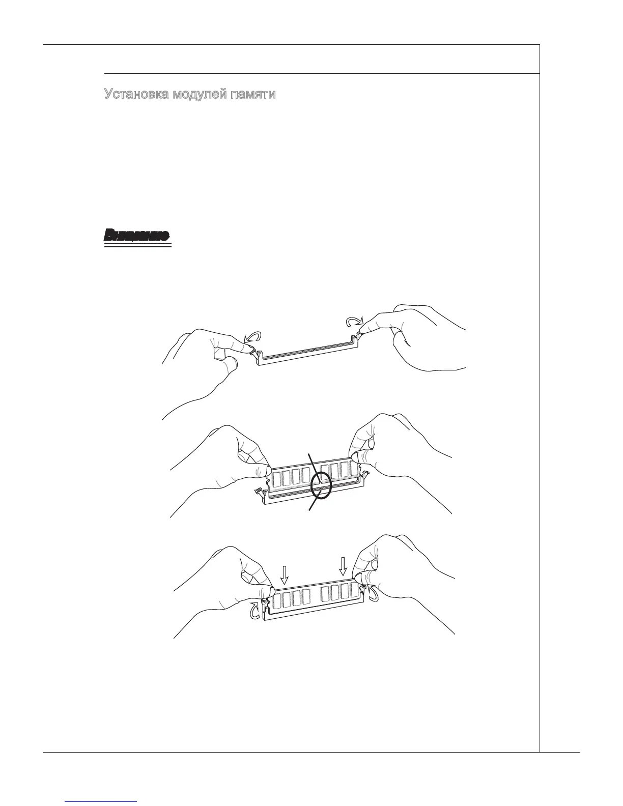 Вставьте модуль в DIMM слот в вертикальном направлении. Затем нажмите