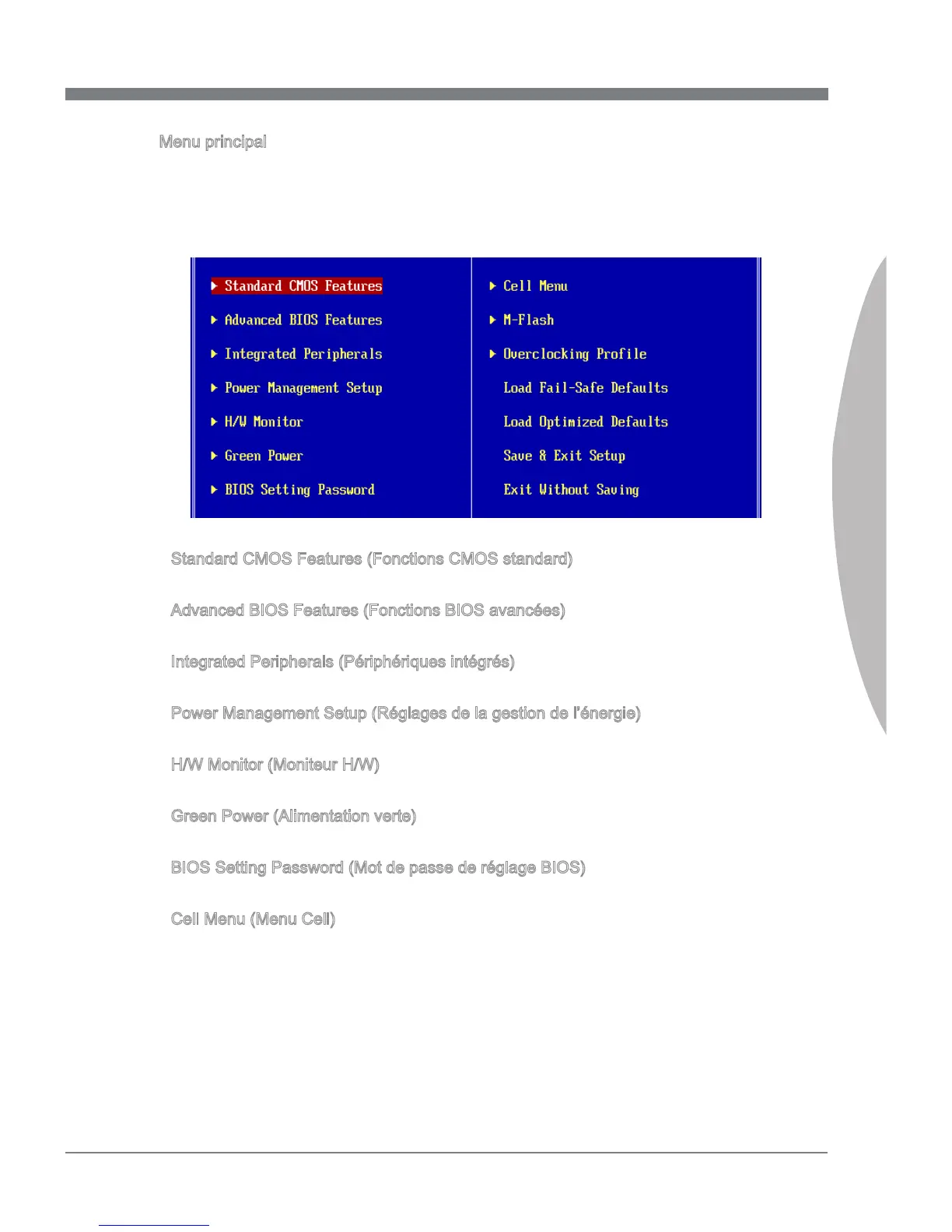 Une fois entré dans l’unité de réglages BIOS CMOS, le menu principal appaît sur