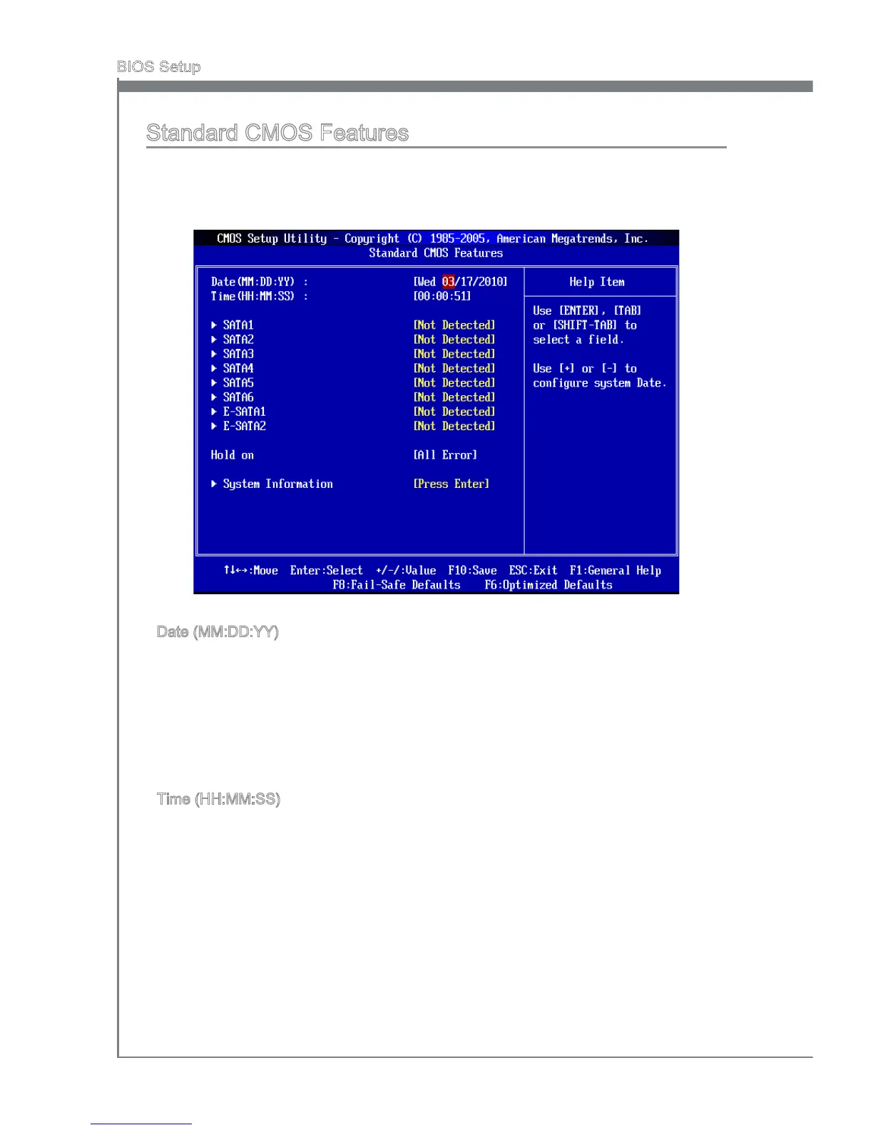 The items in Standard CMOS Features Menu include some basic setup items. Use the
