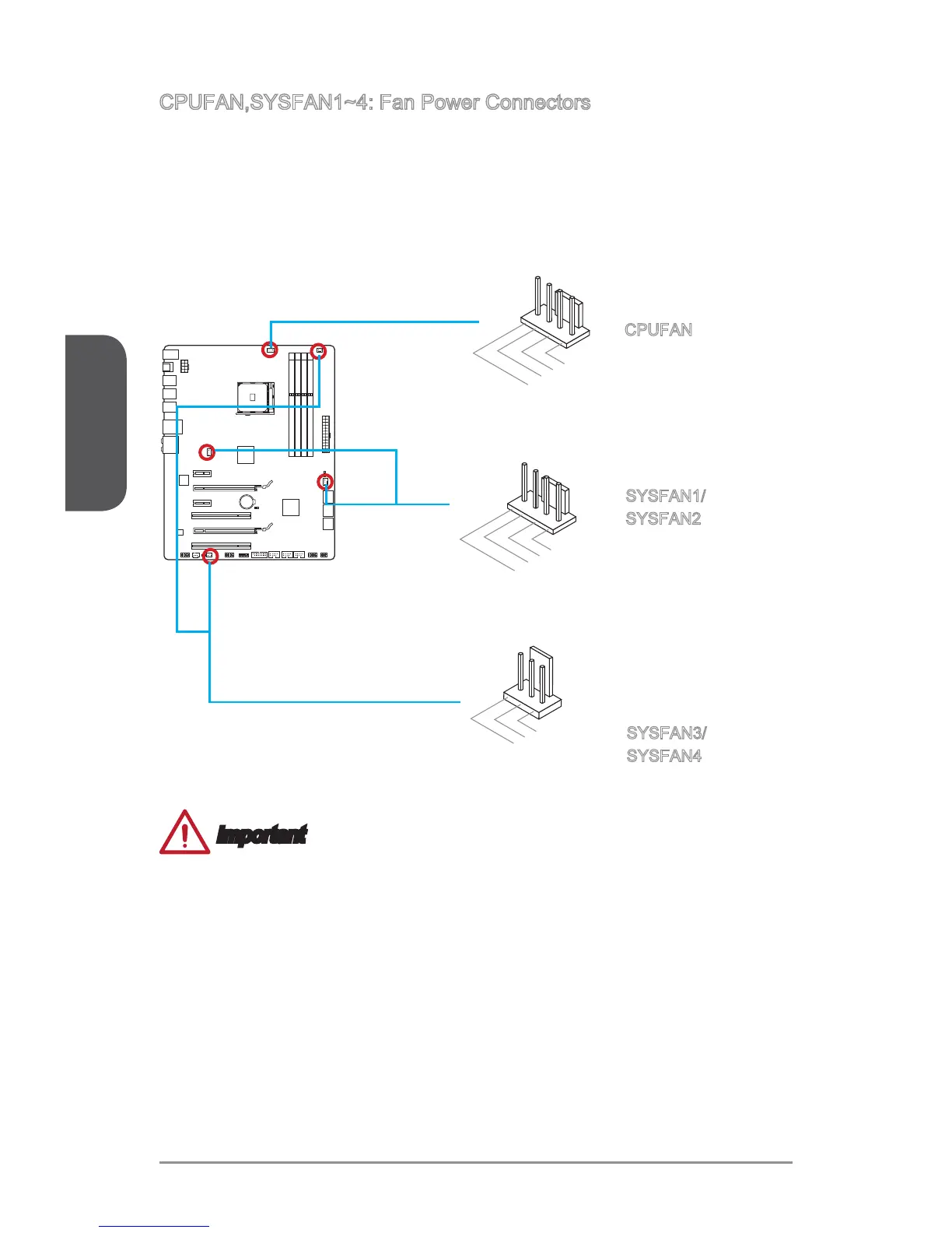 CPUFAN,SYSFAN1~4: Fan Power Connectors