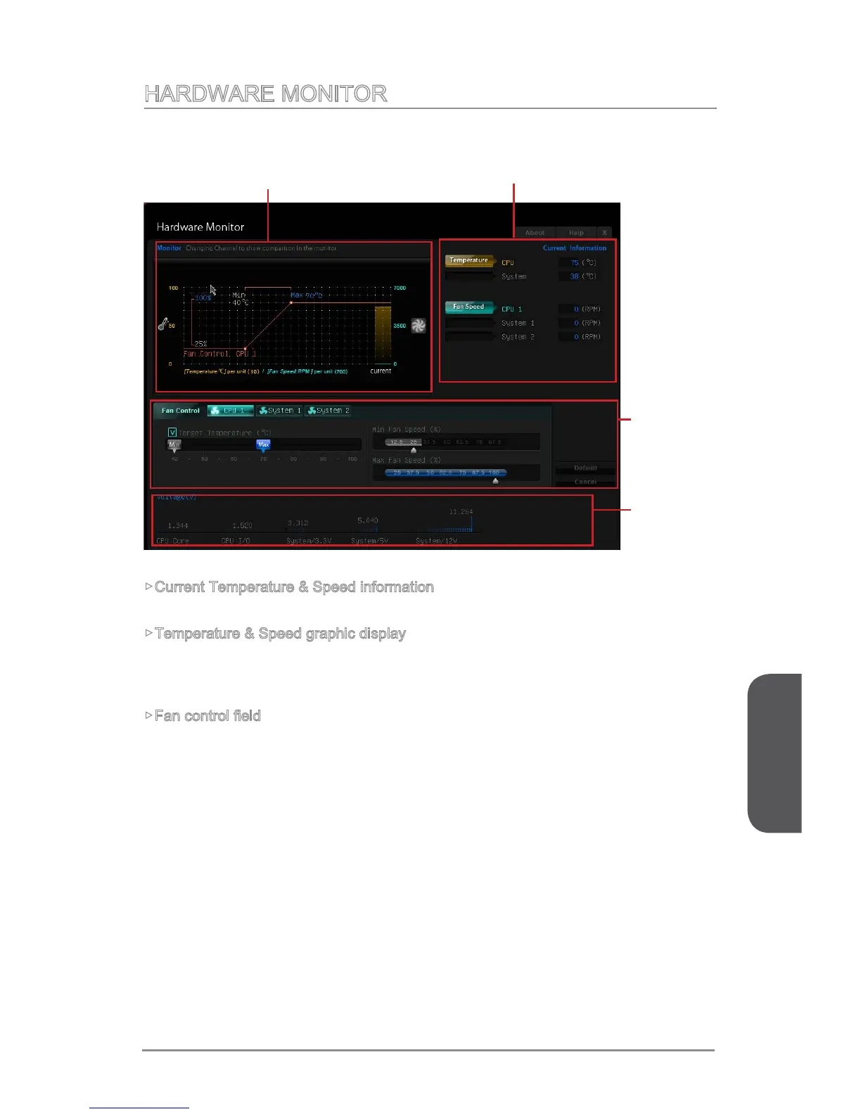 Shows the current CPU temperature, system temperature and fans' speeds.