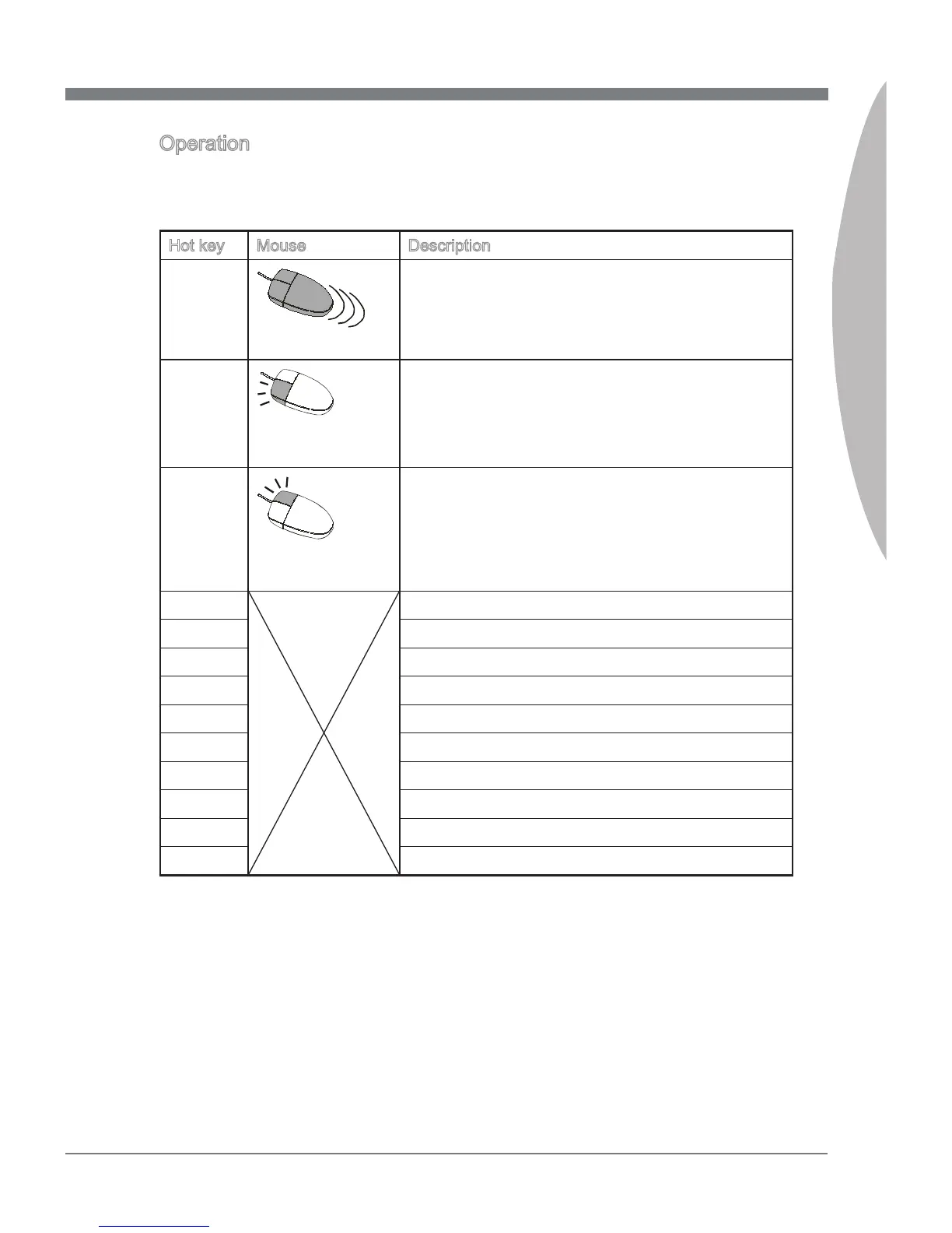 The followng table lsts and descrbes the hot keys and the mouse operatons.