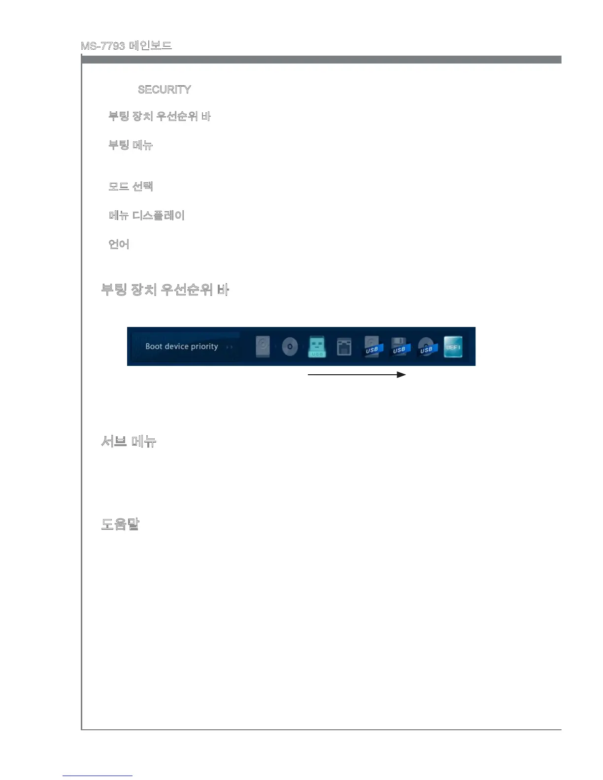 이 바는 부팅 장치의 우선순위를 나타냅니다. 밝아진 아이콘은 장치가 활성화 되었음을