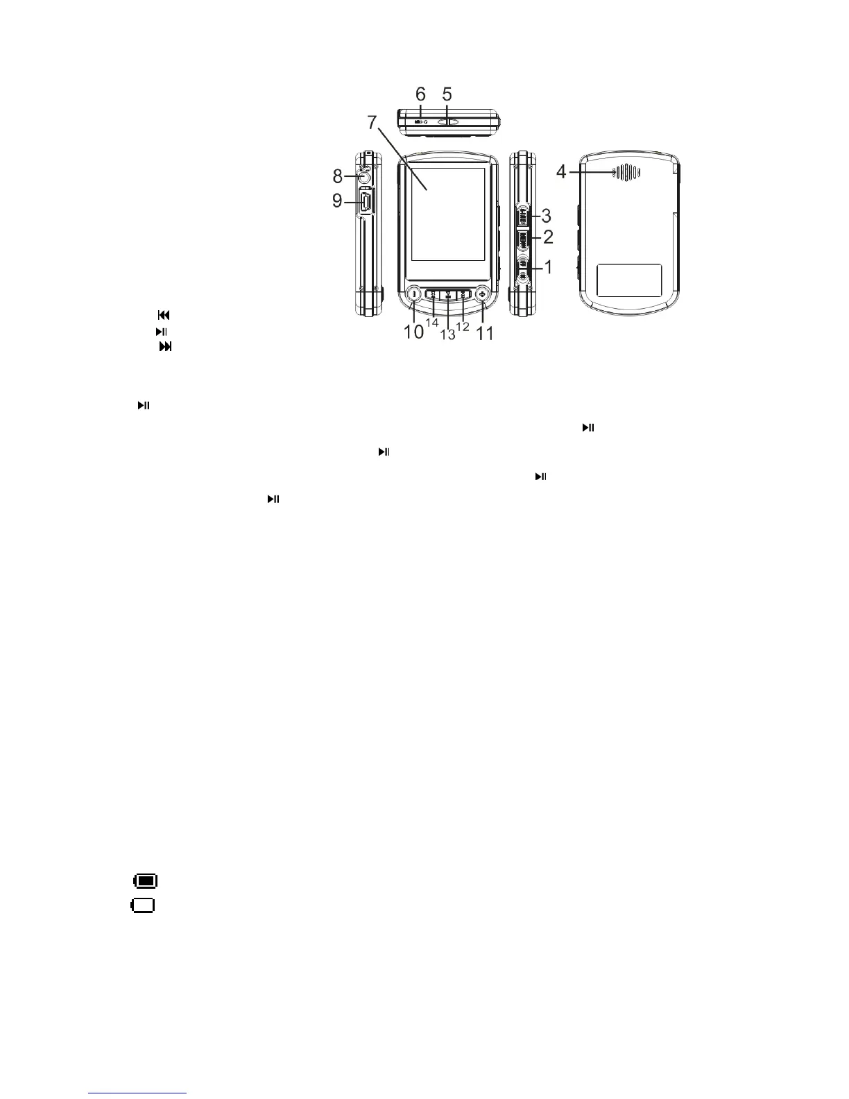 5) - Volume Down: Under the status of play or stop, short press “-” to reduce volume, long press