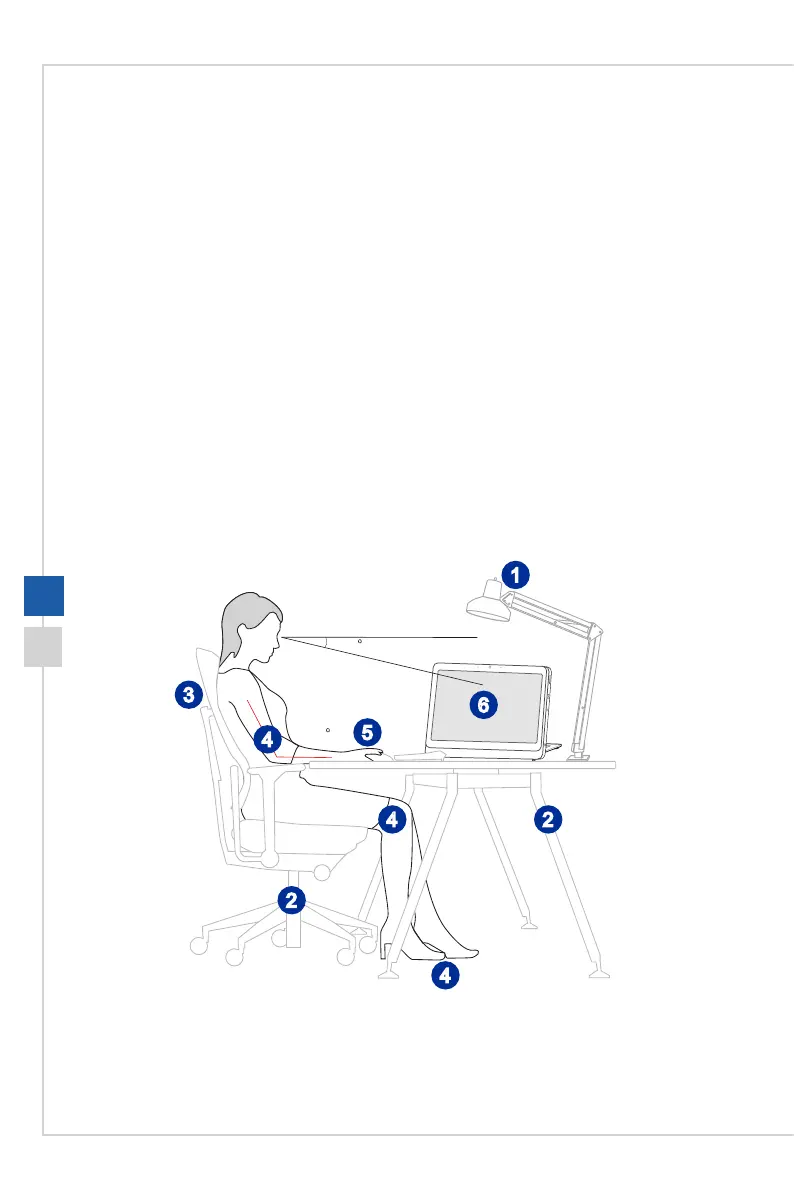 2� Choose the proper desk and chair and adjust their height to t your posture when