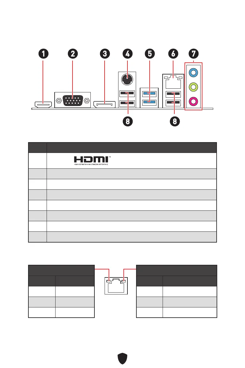 MSI PRO B660M-E DDR4 - Back Panel Connectors; Back Panel Connector Diagram; LAN Port LED Status Table