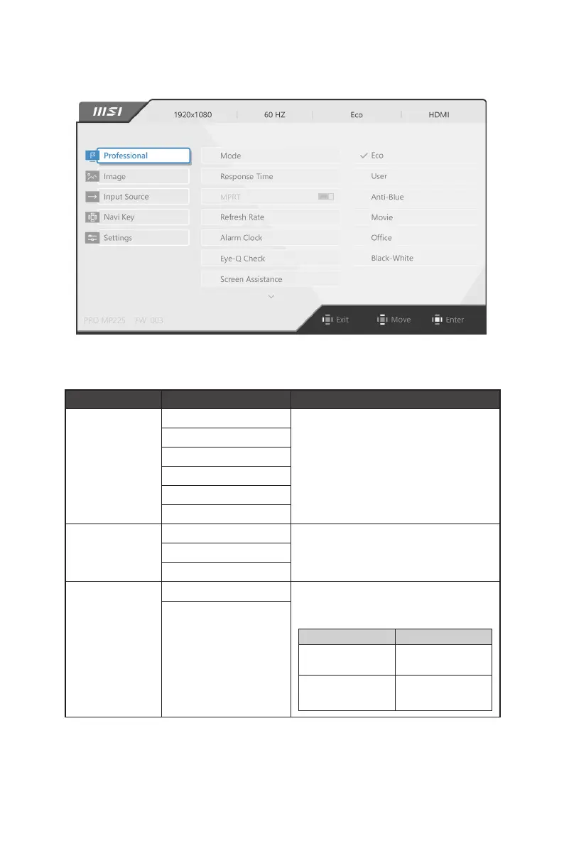 Mode Eco ∙ Use Up or Down Button to select and preview