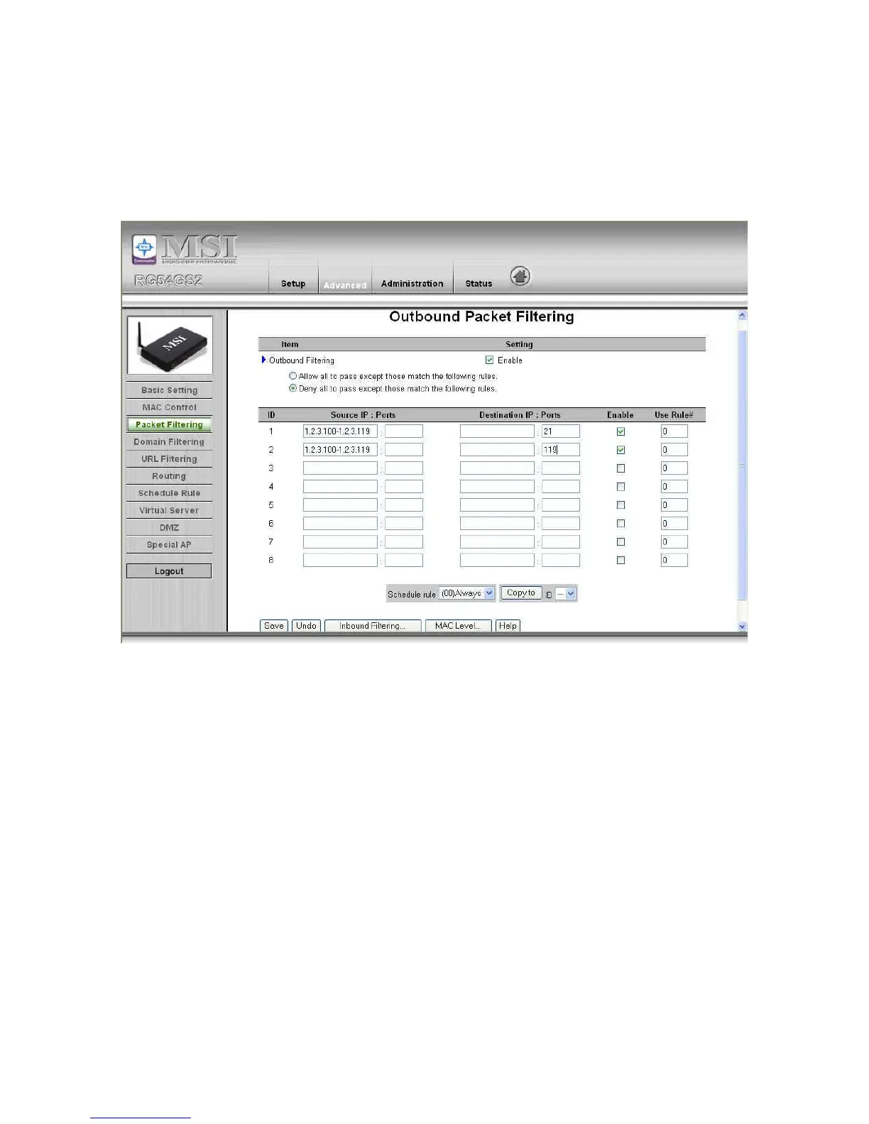 To enable Outbound Packet Filter click the check box next to Enable in the Outbound Packet Filter field.