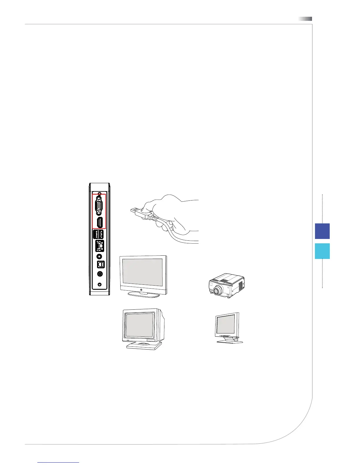 To connect the VGA/ HDMI device, fi rst make sure the Wind Box DC100 and the tar-