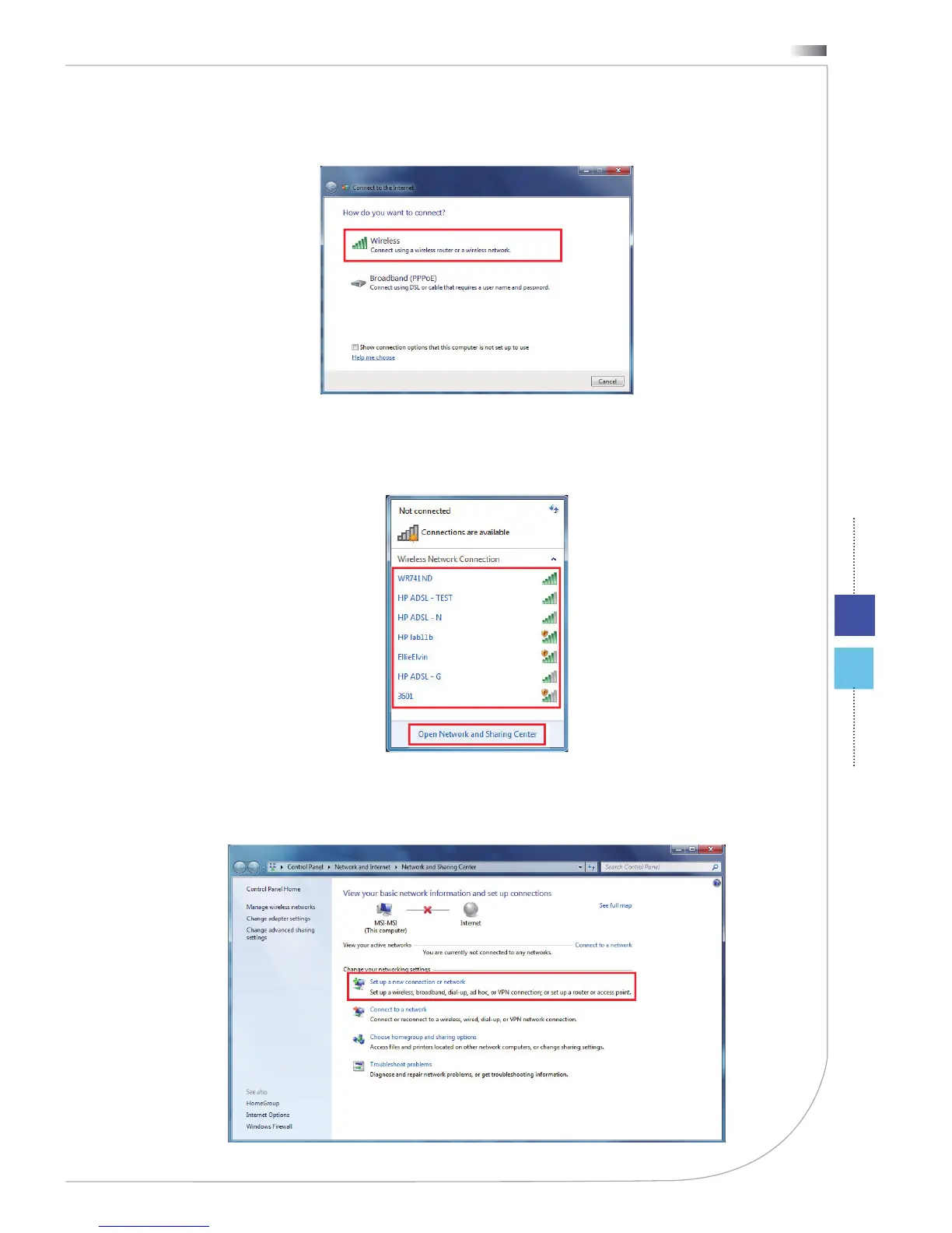 list or click [Open Network and Sharing Center] to establish a new connec-
