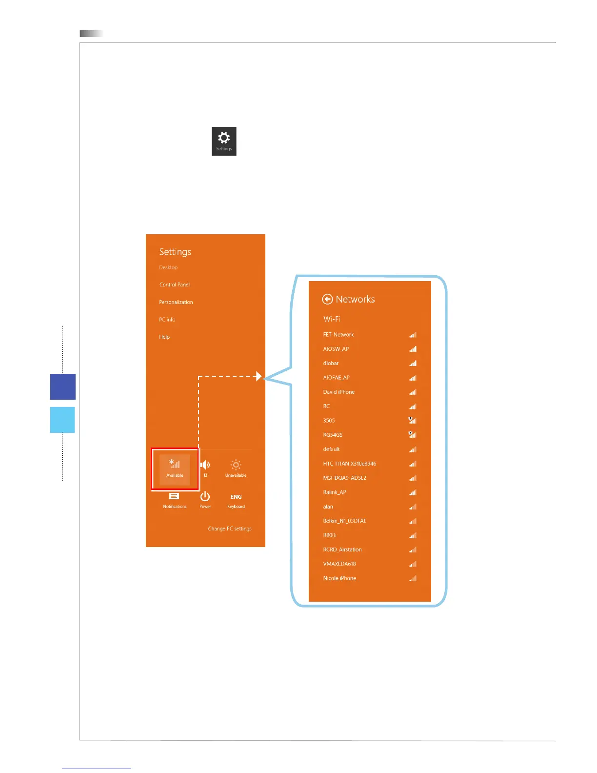 Select [Settings] on Desktop, locate a wireless icon with available net-
