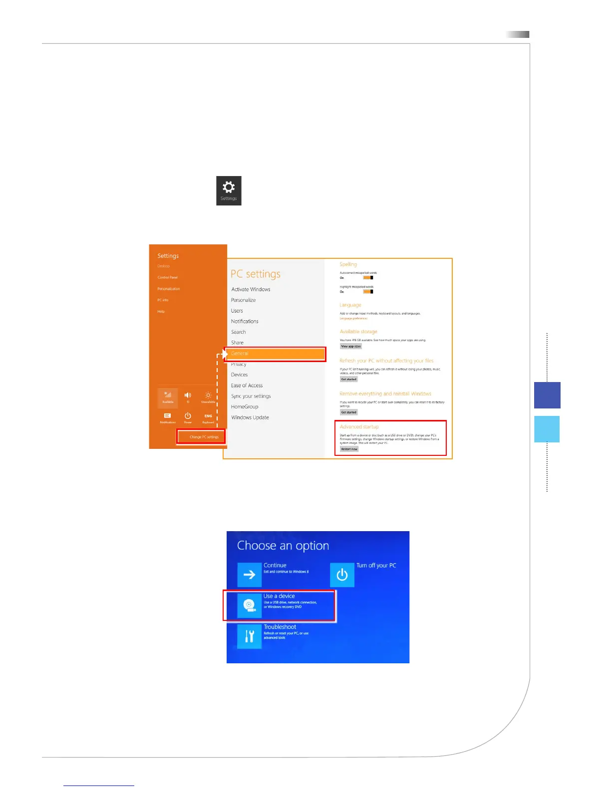 Select [Settings] on Desktop, then “Change PC settings” to enter PC