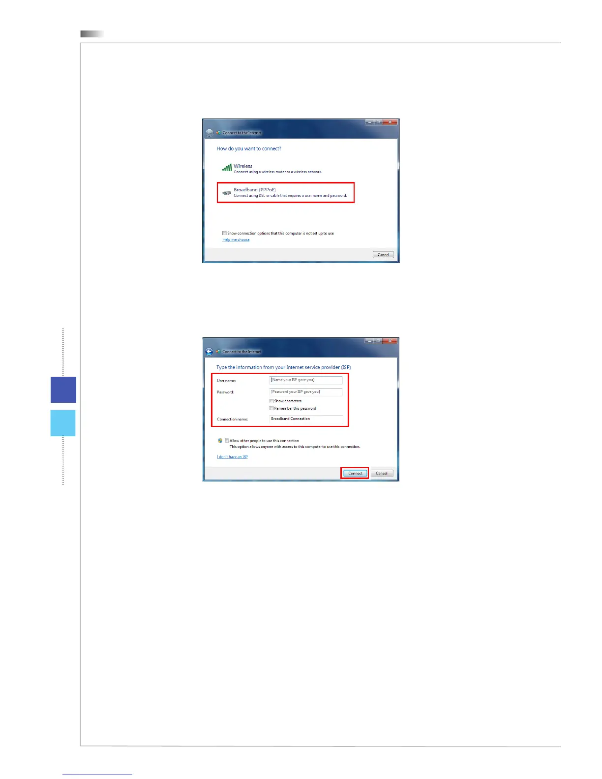 4. Type the information from your Internet Service Provider (ISP) and click [Connect]