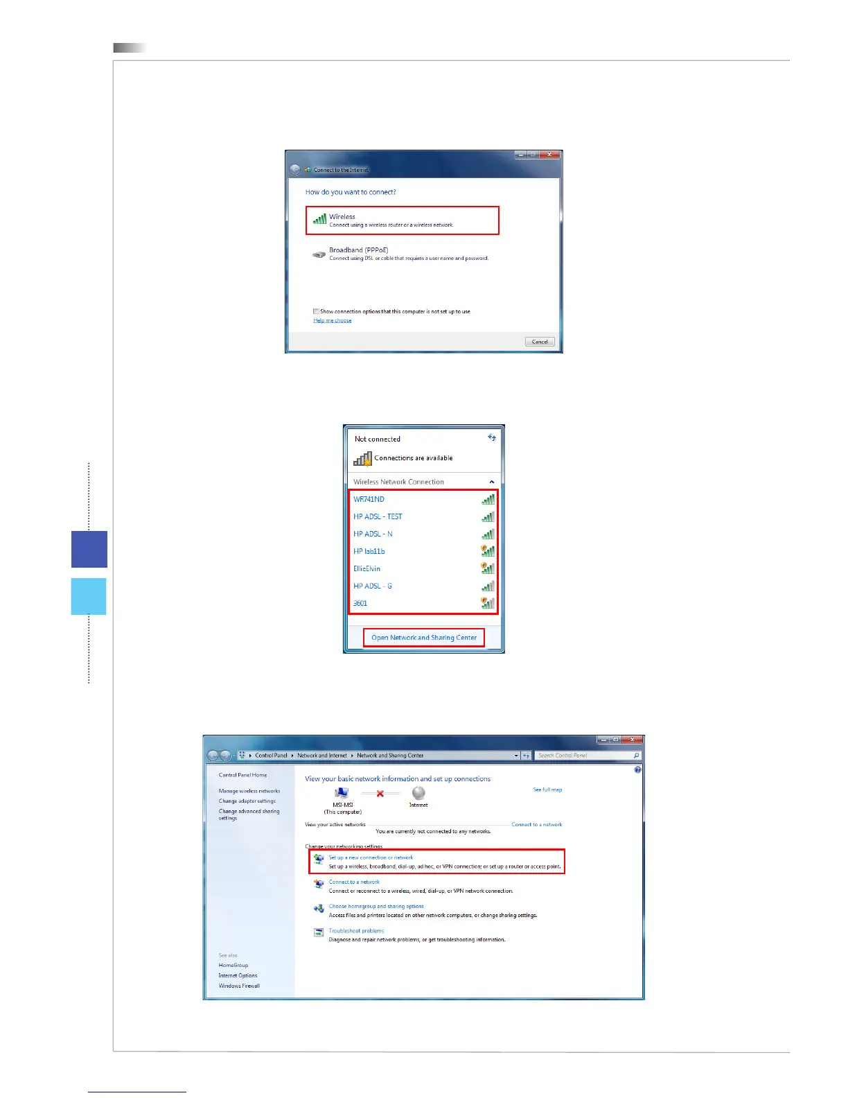 click [Open Network and Sharing Center] to establish a new connection.