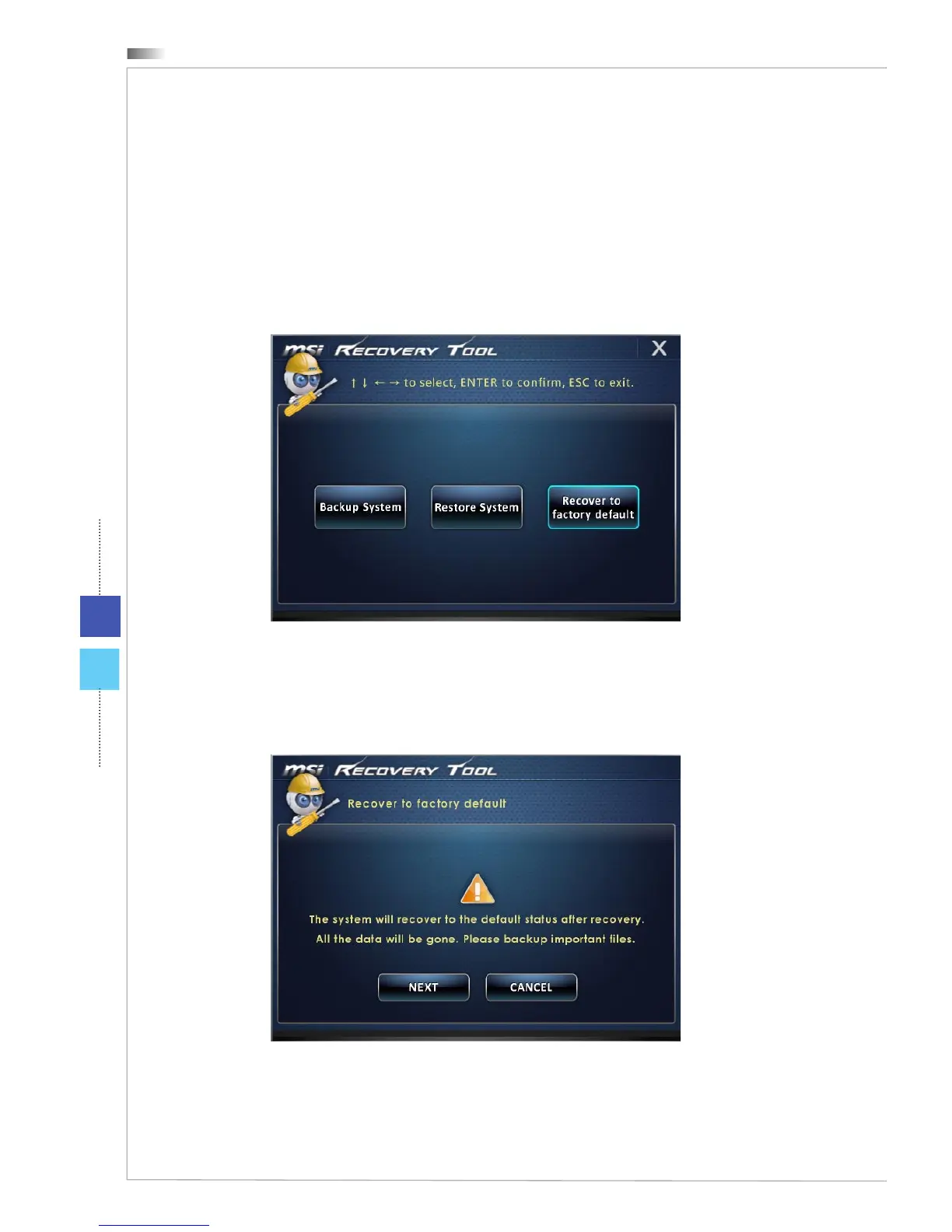 1. Select [Recover to factory default] to enter. Alternatively, select [X] or press [Esc] on