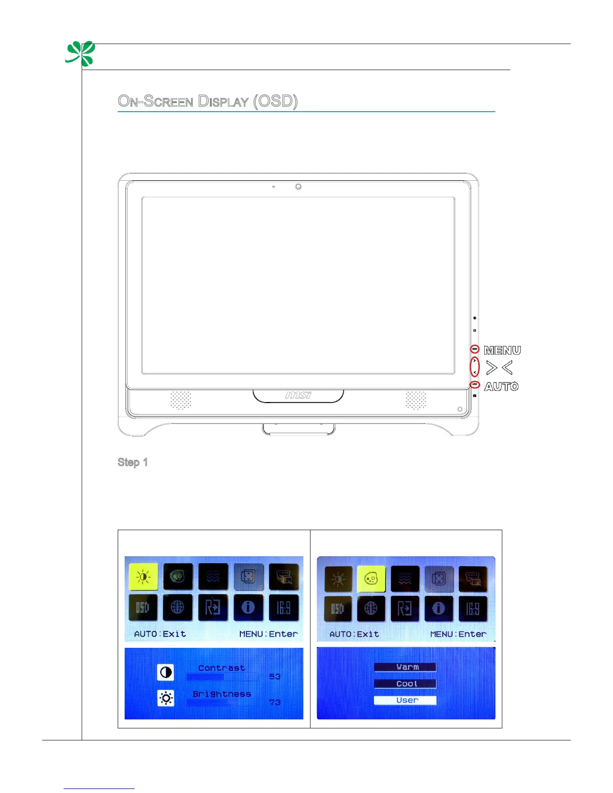 The on-screen display (OSD) allows you to tune the viewing options of the moni-