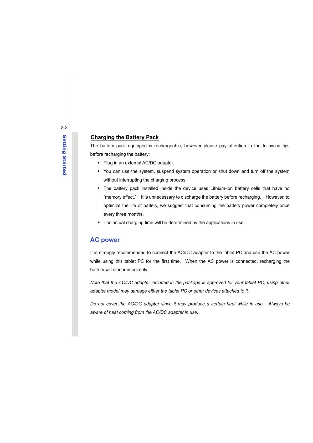 It is strongly recommended to connect the AC/DC adapter to the tablet PC and use the AC power