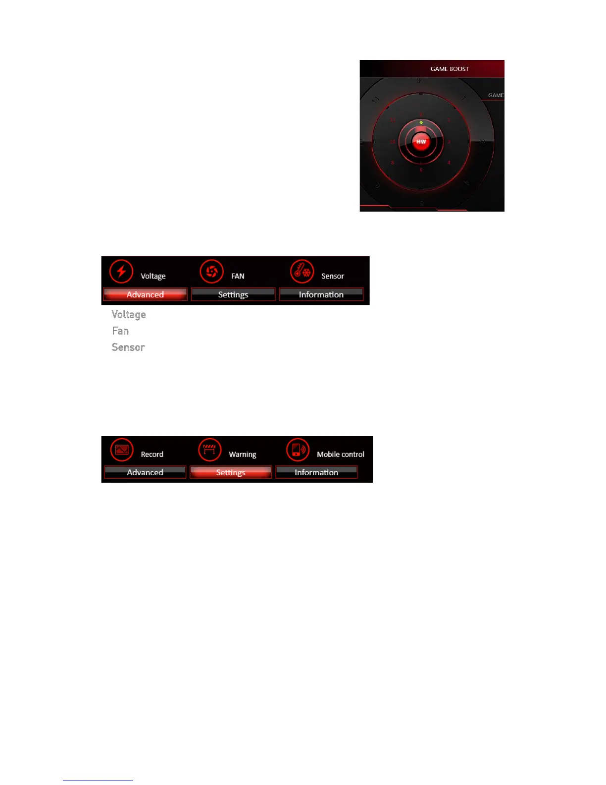 When click the Advanced button, The Voltage, Fan and DRAM icons will appear.