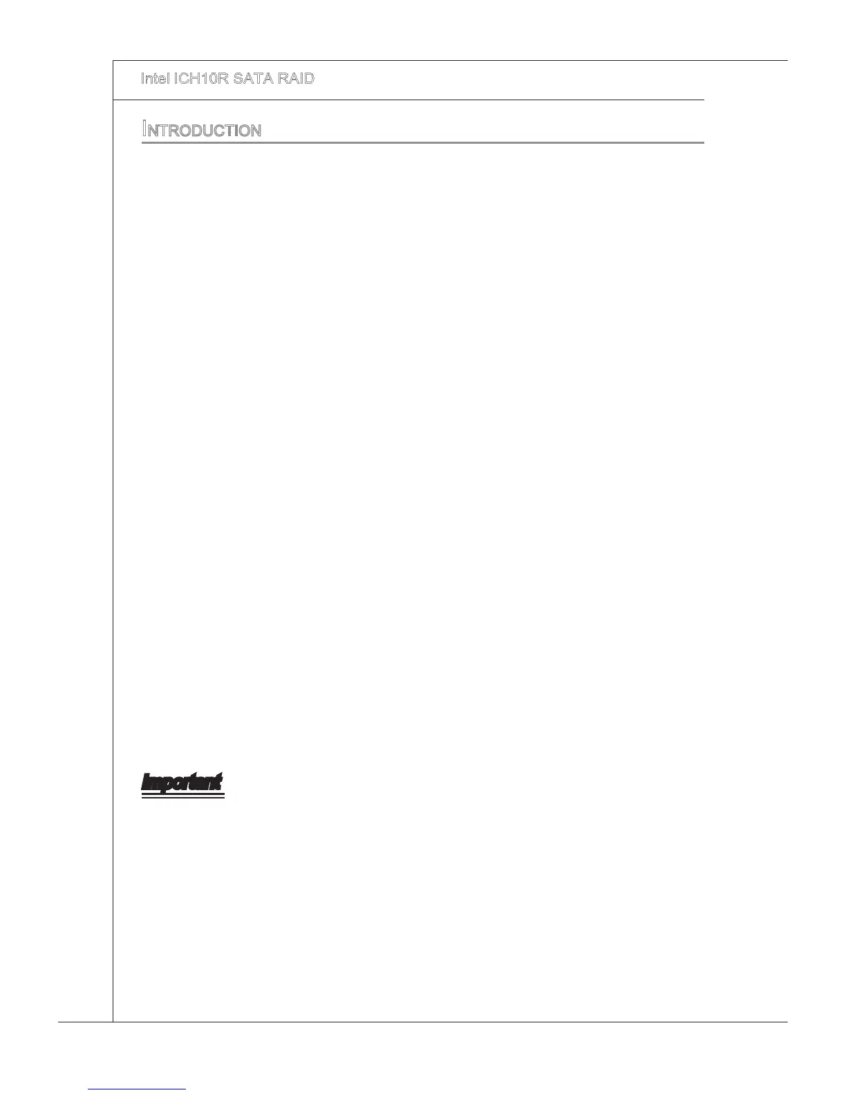 ICH10R oers RAID level 0 (Strpng), RAID level 1 (Mrrorng and Duplexng),