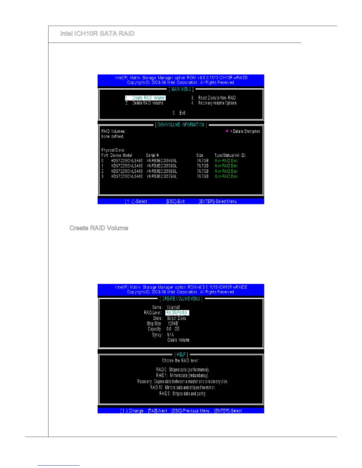 Select opton 1 Create RAID Volume” and press <Enter> key. The followng screen
