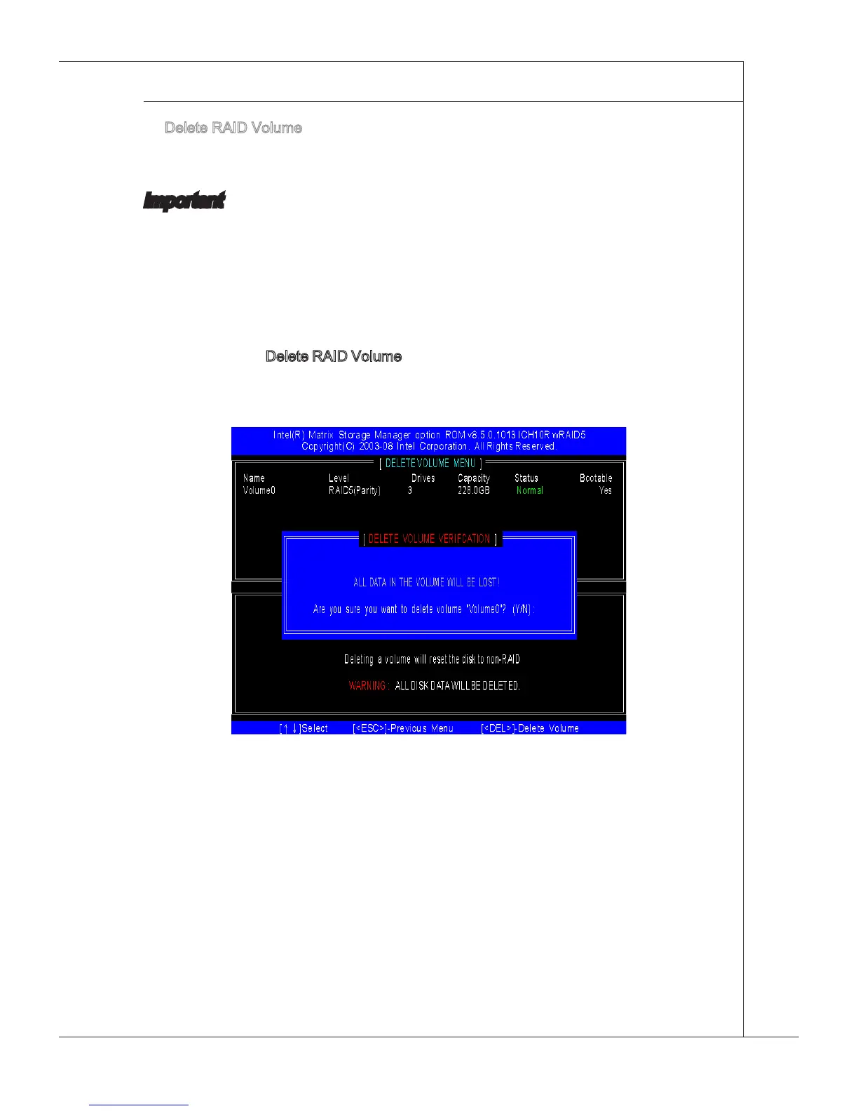 key to select a RAID volume for deleton. Then press <Delete> key to delete the