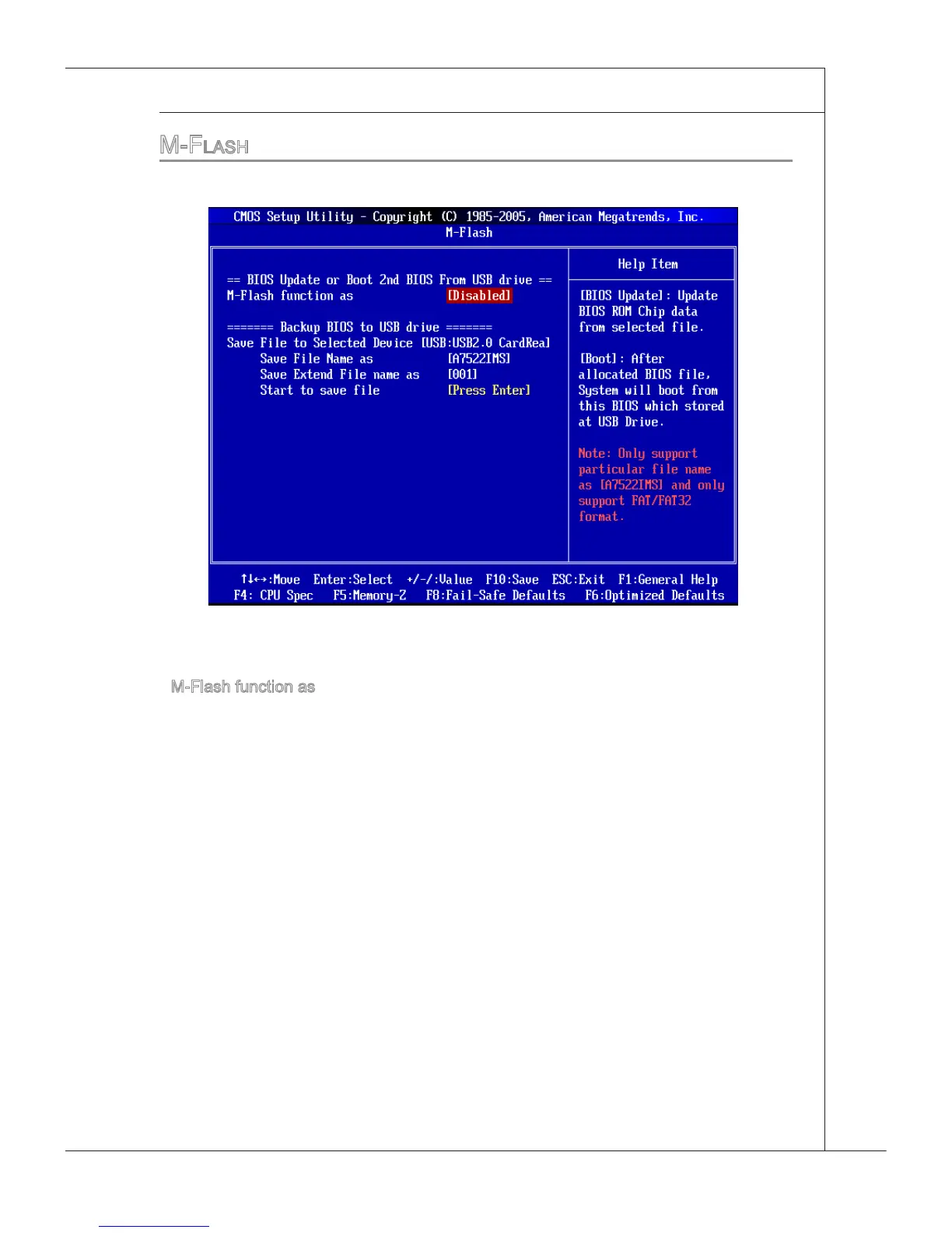 M-Flash funcon allows you to ash BIOS from USB drve/ storage drve (FAT/ FAT32