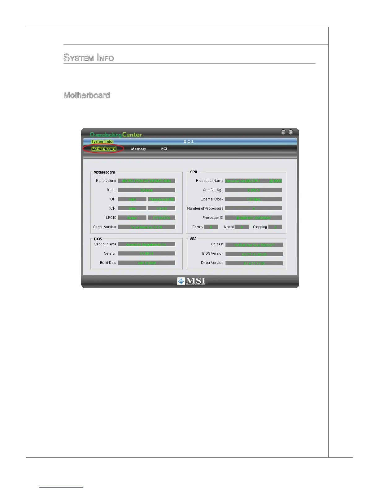 In the System Info screen, you can read the nformatons of manboard/ memory/ PCI.
