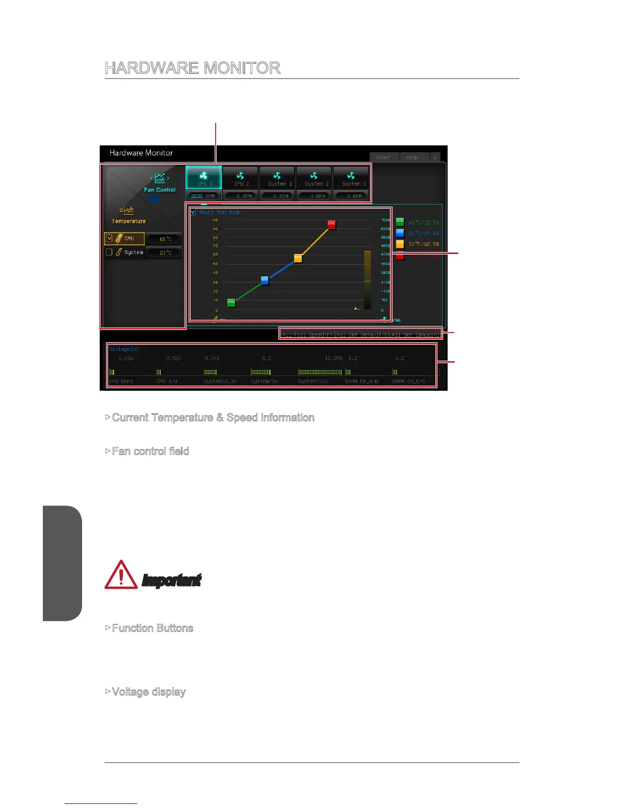Shows the current CPU temperature, system temperature and fans' speeds.