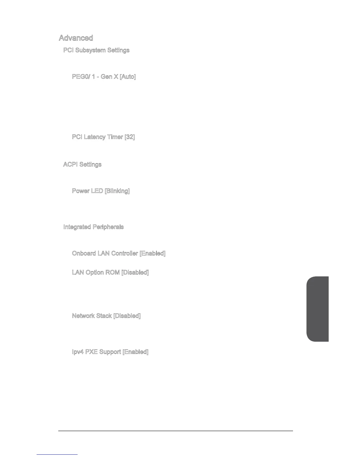 Sets PCI Express protocol for matching dierent installed devices. PEG0, PEG1