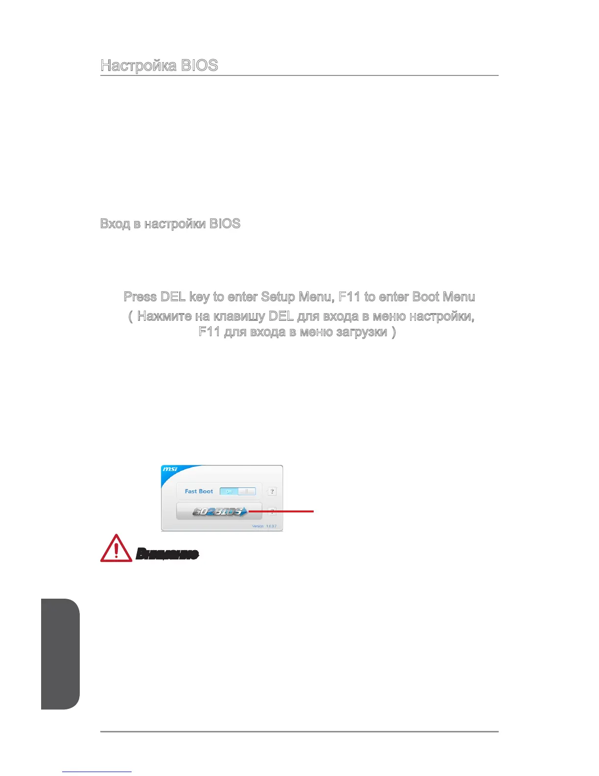 BIOS. Вы можете нажать “GO2BIOS” на экране в утилите “MSI Fast Boot” или