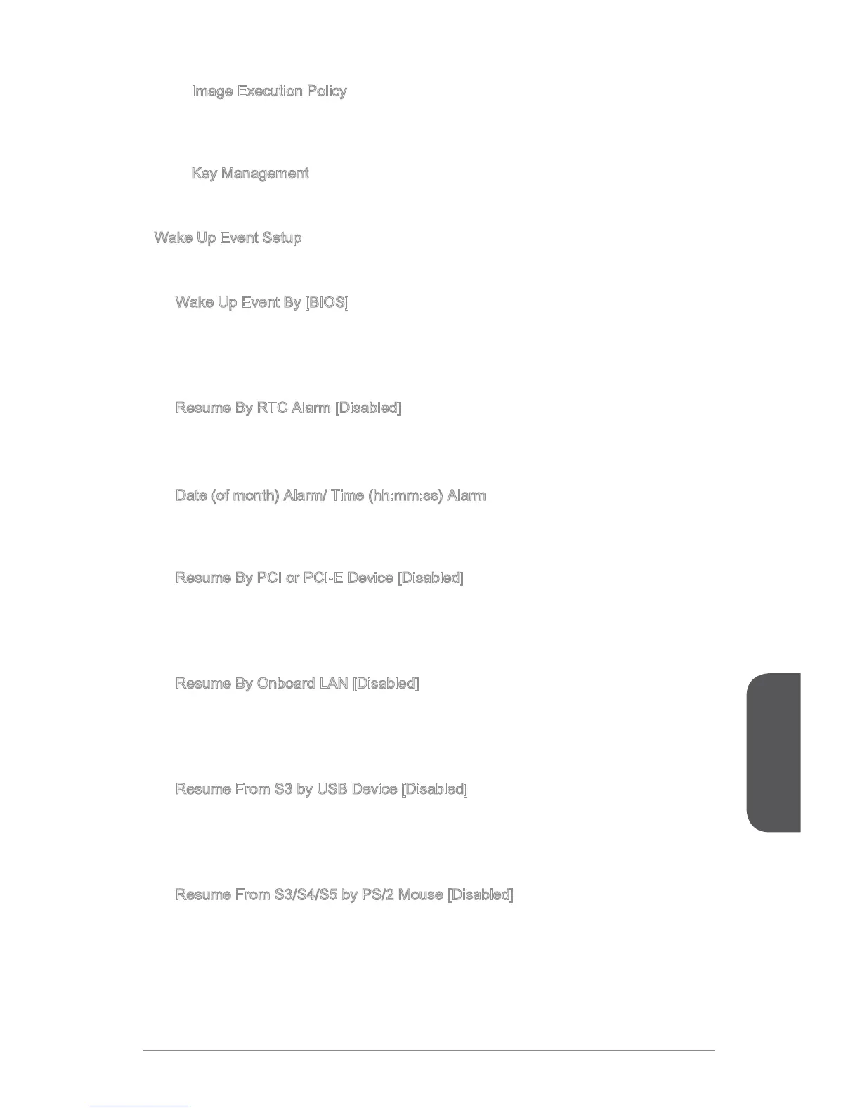 Sets system wake up behaviors for different sleep modes. Press <Enter> to enter the