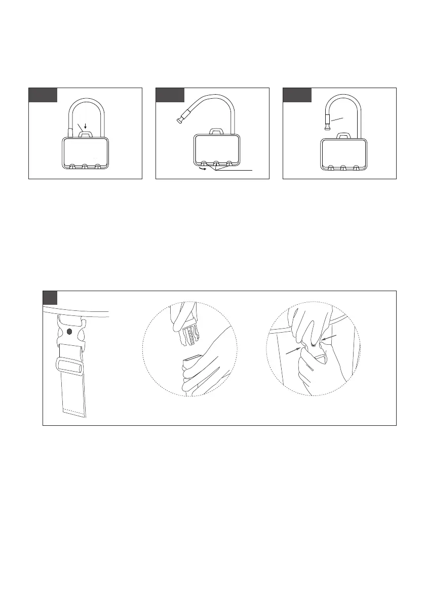 ● Pincer les deux côtés de la boucle verrouillée et appuyer sur le point rond au centre en même