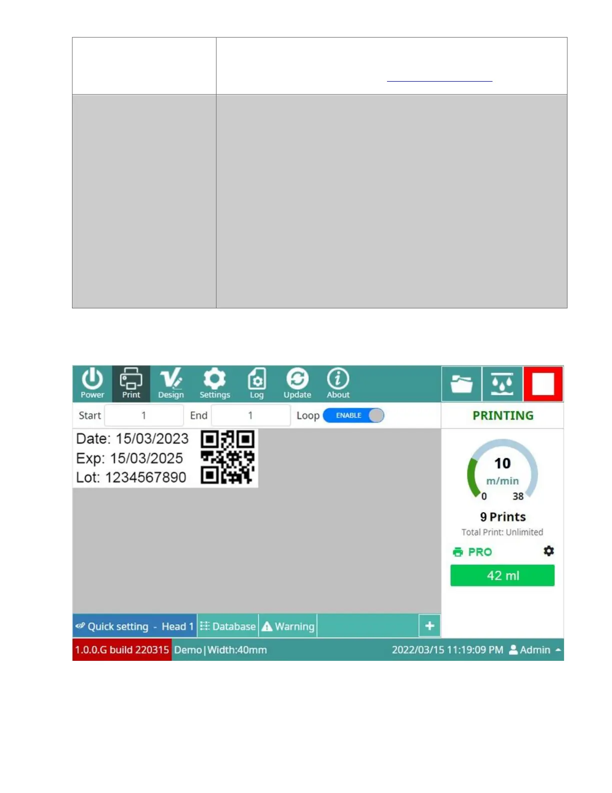 Refer to the printing speed table at Printing Speed Table.