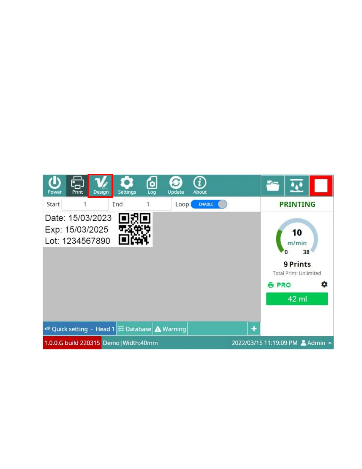 Set up the software (Design template, Resolution, Density and Print mode, etc).