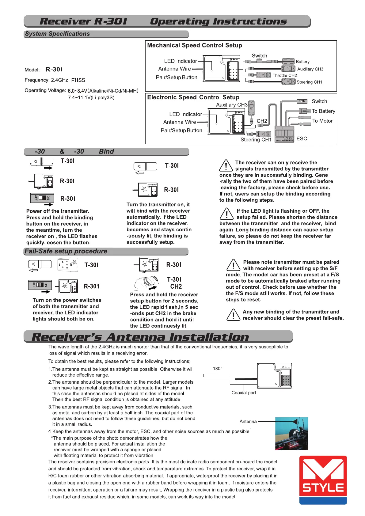 Mstyle T-301 - Receiver R-301 Operating Instructions; Receiver System Specifications; Speed Control Setup; Binding Transmitter and Receiver