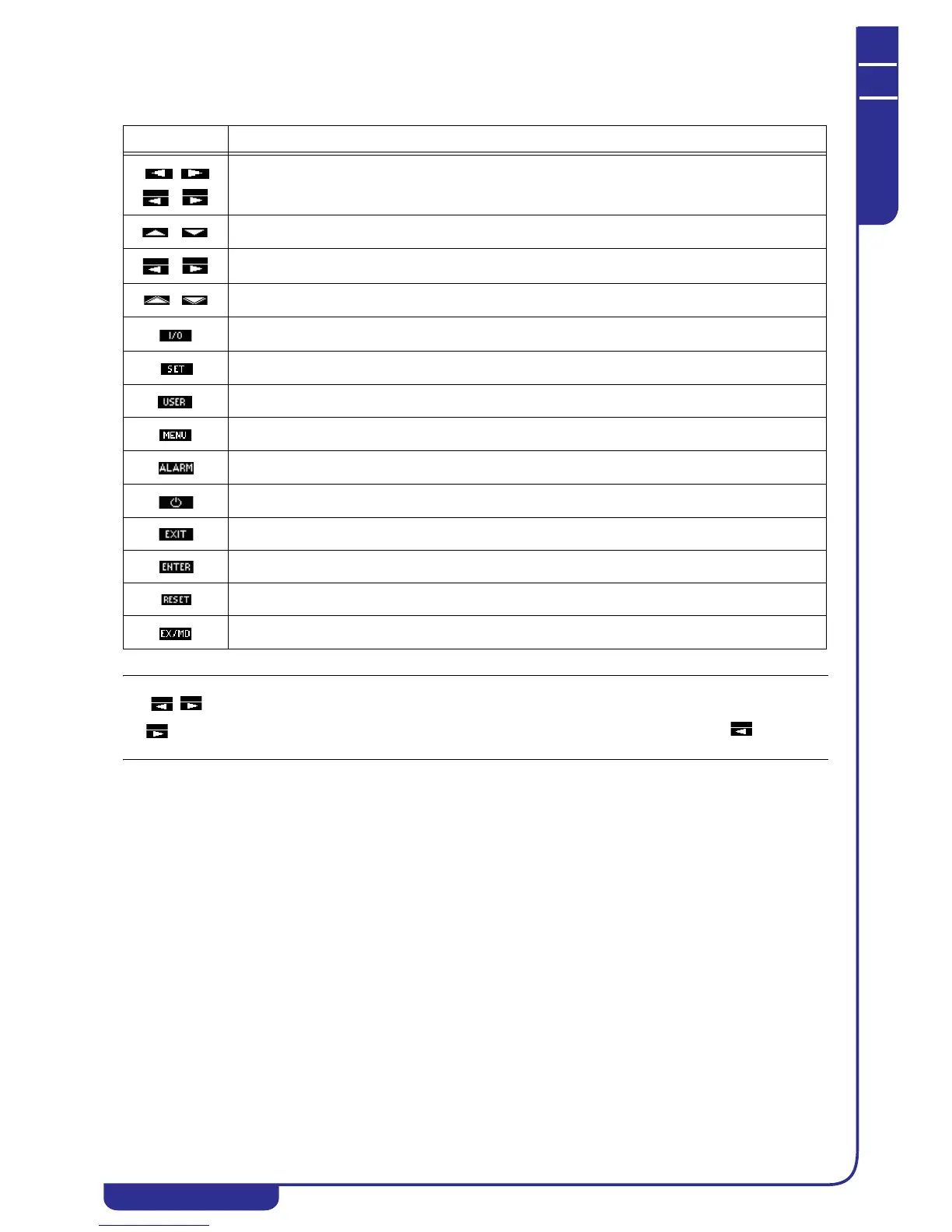 The following table illustrates the meaning of all the keys on the display.
