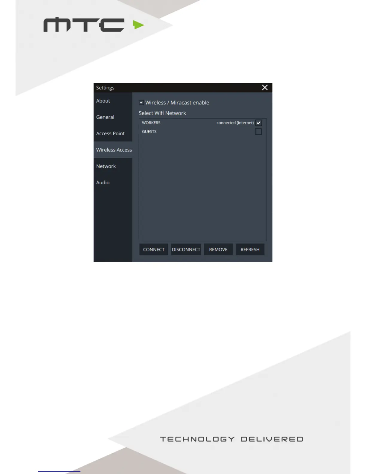Use this tab to connect MTC-5000 unit to a wireless network and manage existing networks.