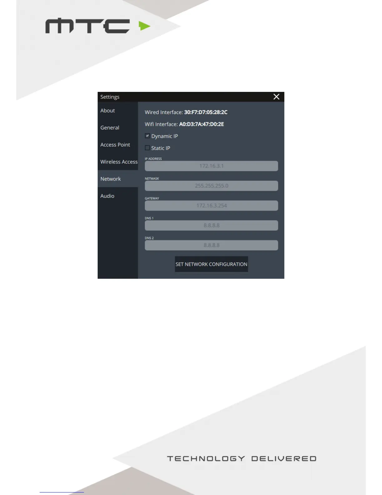 View the MAC addresses for the MTC-5000 unit and choose between a dynamic and static IP.