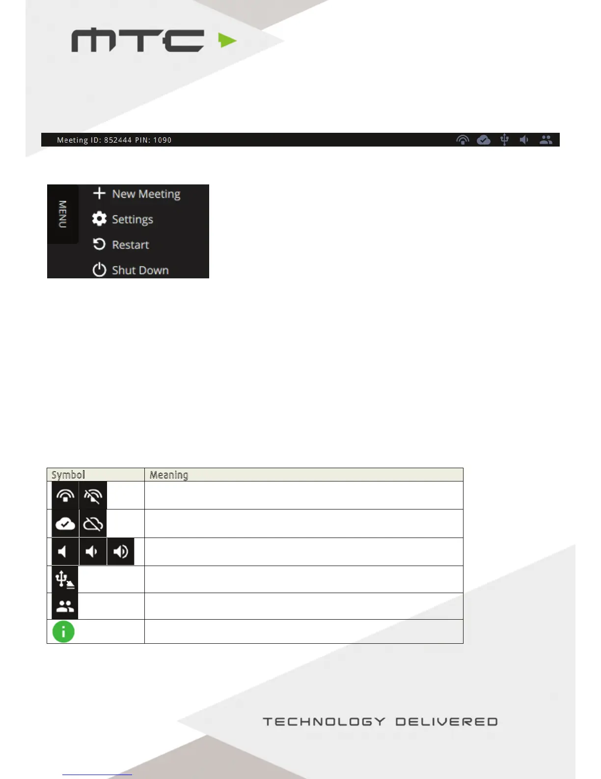 Click or tap on the Meeting ID at the bottom any time to view the MTC-5000 Meeting ID screen. This