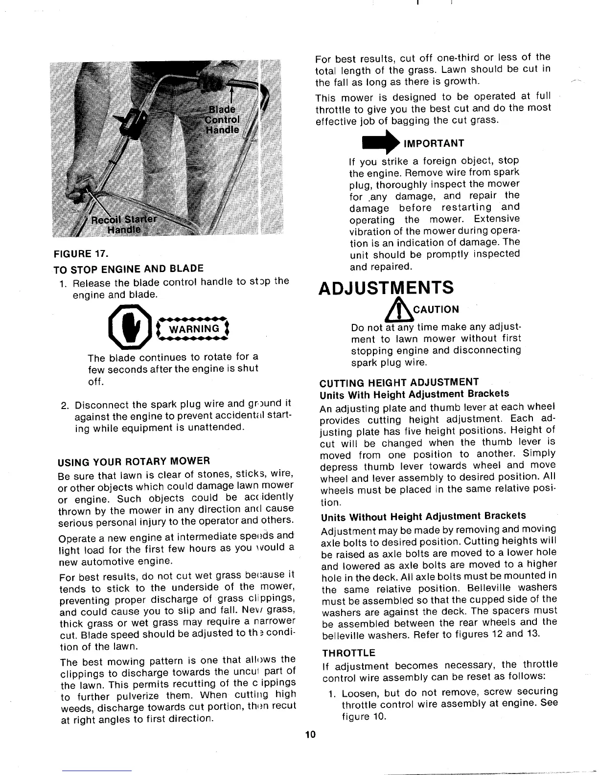 MTD 115-062-352 - Stopping and Safe Usage Practices; Adjustments and Settings; Cutting Height Adjustment; Throttle Control Adjustment