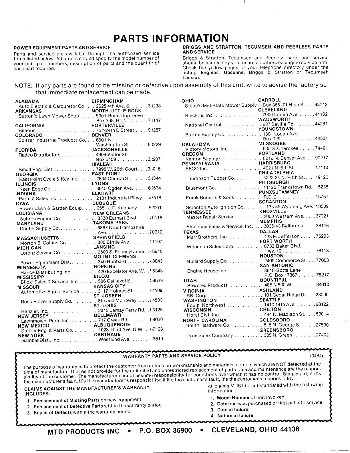 MTD 115-062-352 - Parts and Service Information; Authorized Service Centers; Warranty Policy and Claims
